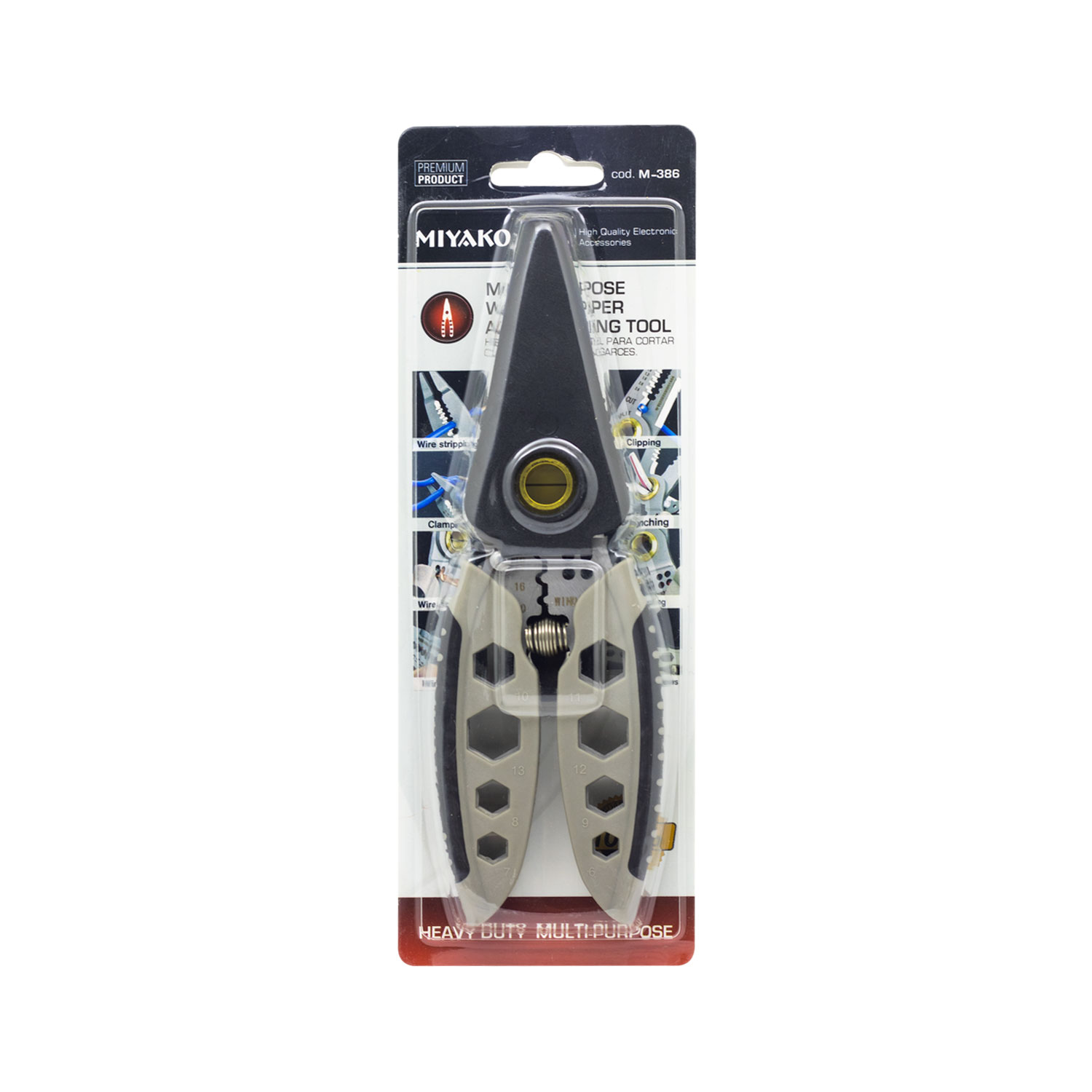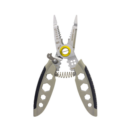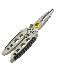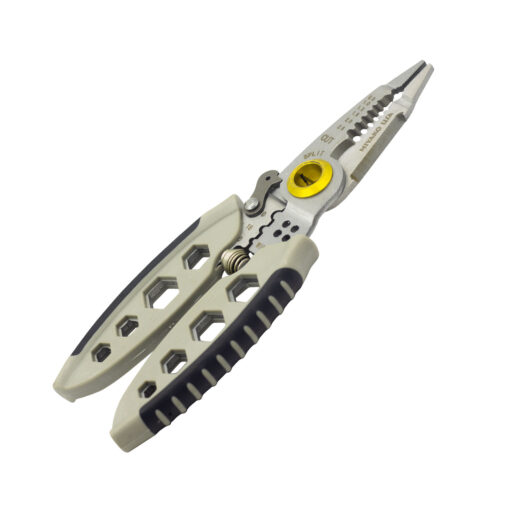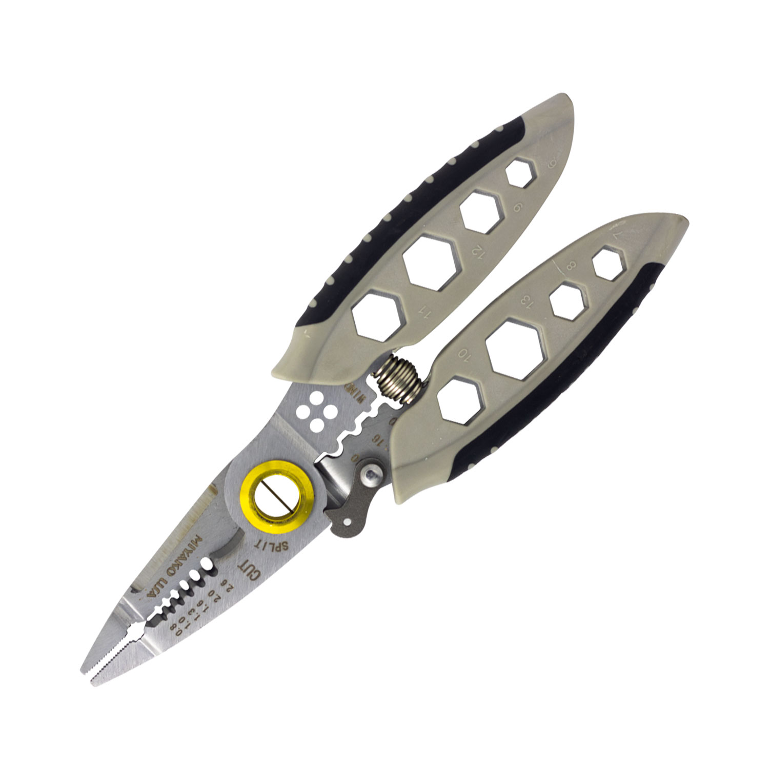 Herramienta multifuncional para diversas tareas eléctricas, incluyendo cortar, pelar, engarzar, enrollar, dividir, sujetar y torcer cables.