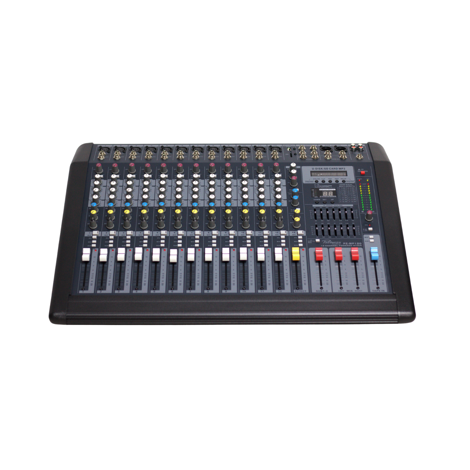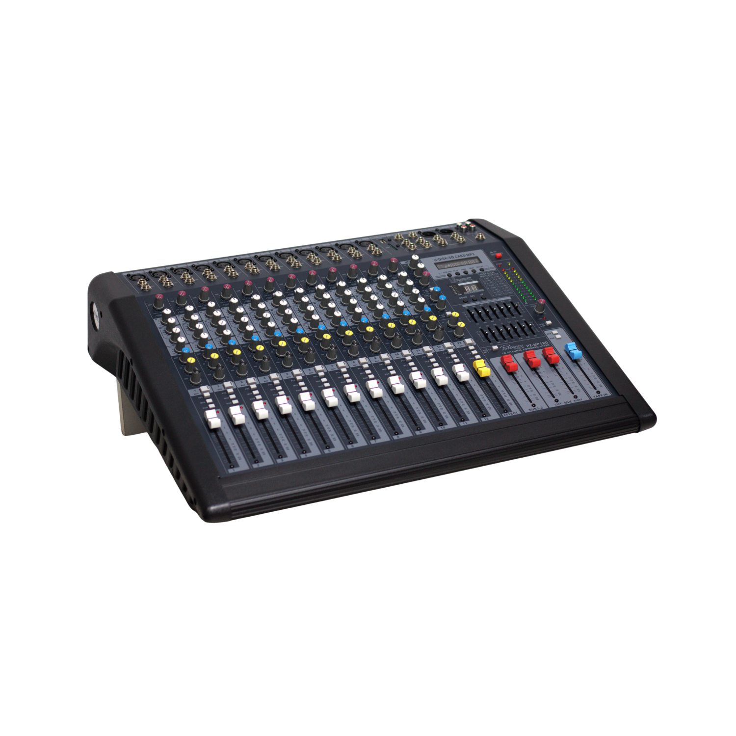 Consola de audio amplificada profesional de 12 canales, diseñada para ofrecer alta potencia, claridad de sonido y múltiples opciones de conectividad.
