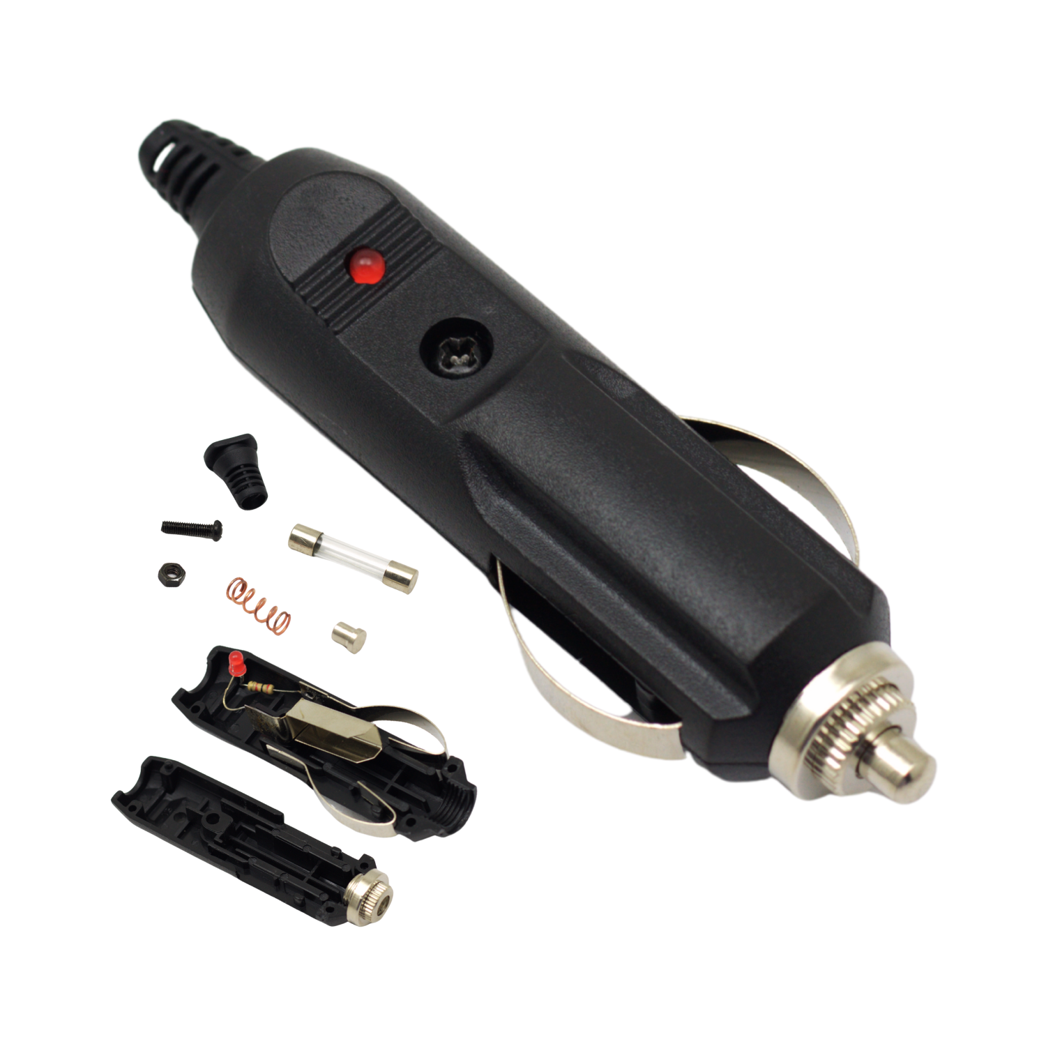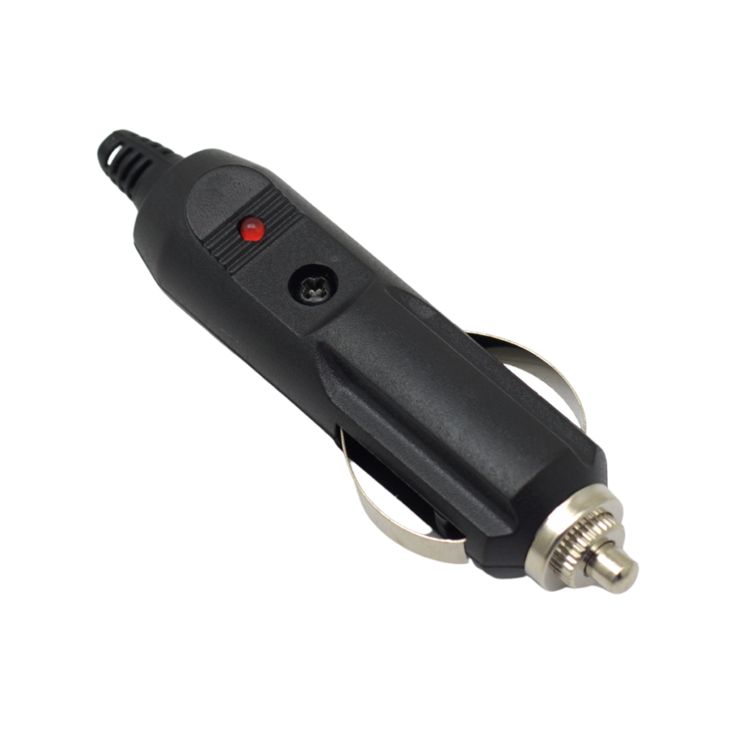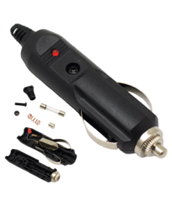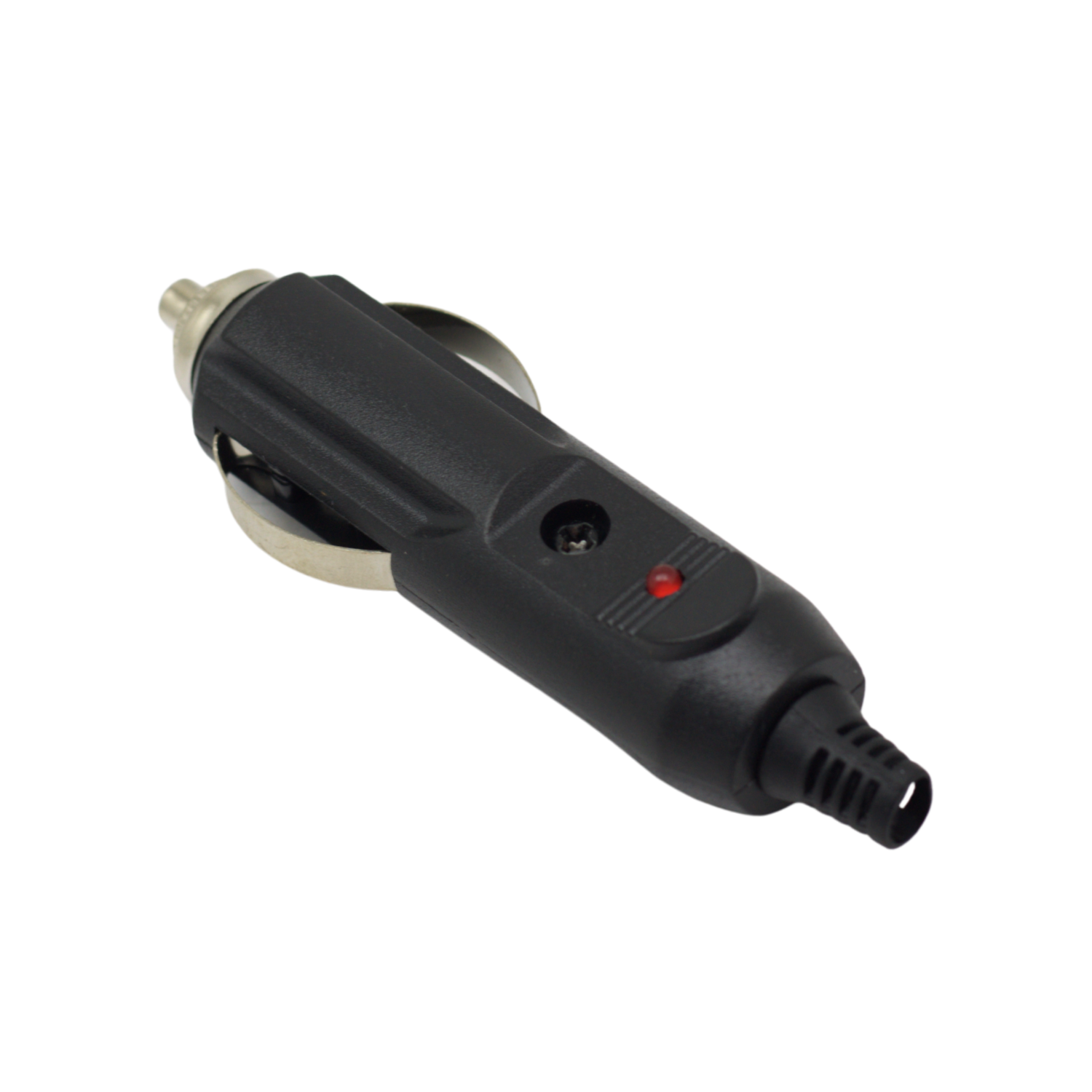 Enchufe para encendedor de cigarrillos, diseñado para funcionar con sistemas eléctricos de 12V DC. Cuenta con toma hembra estándar, fusible de protección, perno de fijación y resorte interno de alta calidad. Ideal para alimentar y cargar dispositivos electrónicos dentro del vehículo.