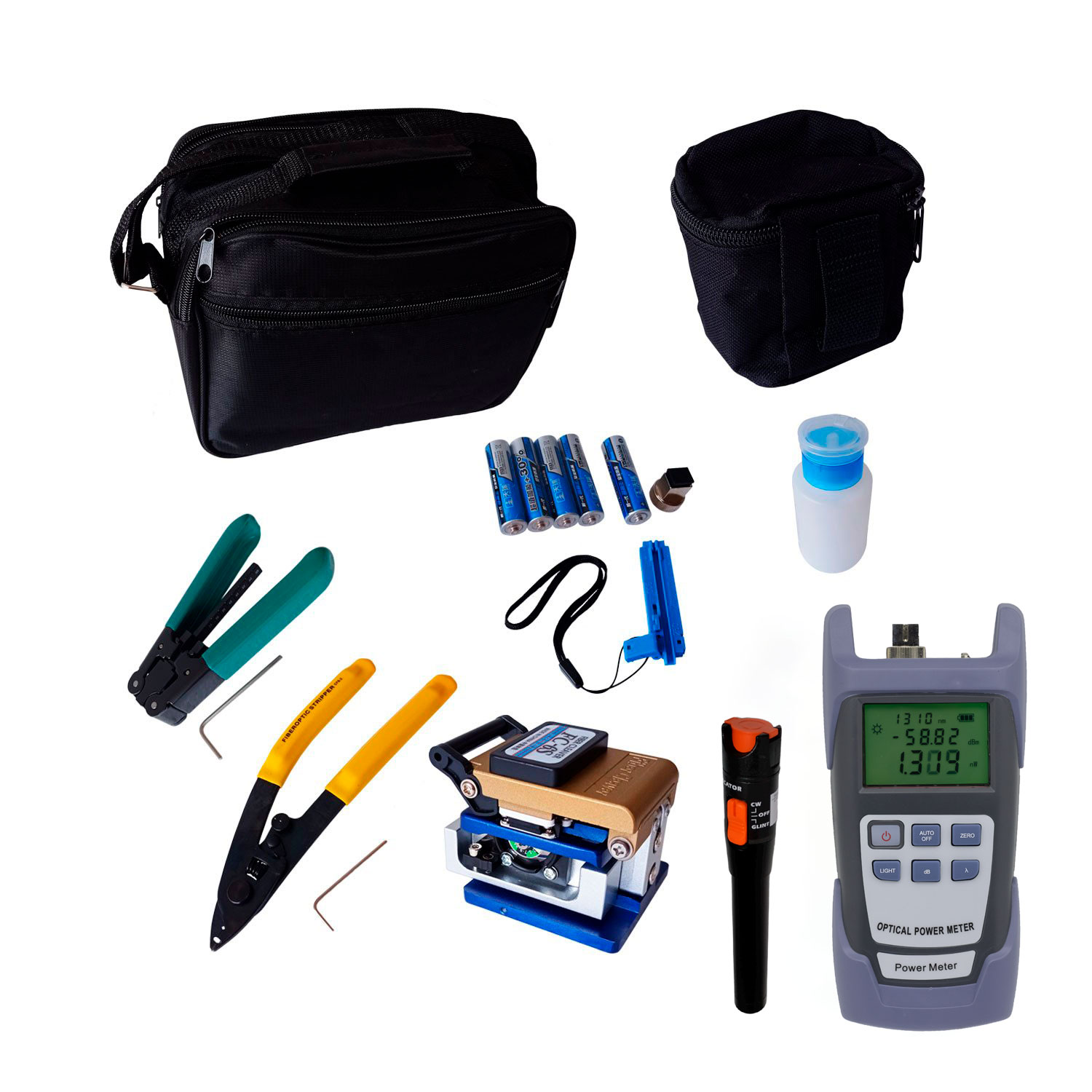 | INCLUYE | 1. Bolsa de transporte para todo el kit de herramientas 2. Medidor de potencia óptica 3. Adaptador SC para medidor de potencia óptica 4. Localizador Visual de Fallas (5km) 5. FC-6S de cuchilla de fibra 6. Bolsa de cuchilla de fibra 7. Pelacables CFS-2 de fibra óptica 8. Pelacables de fibra 9. Botella de Alcohol 10. Pelacables de longitud fija 11. 2 piezas de herramientas Allen ajustables para cuchilla de fibra |
