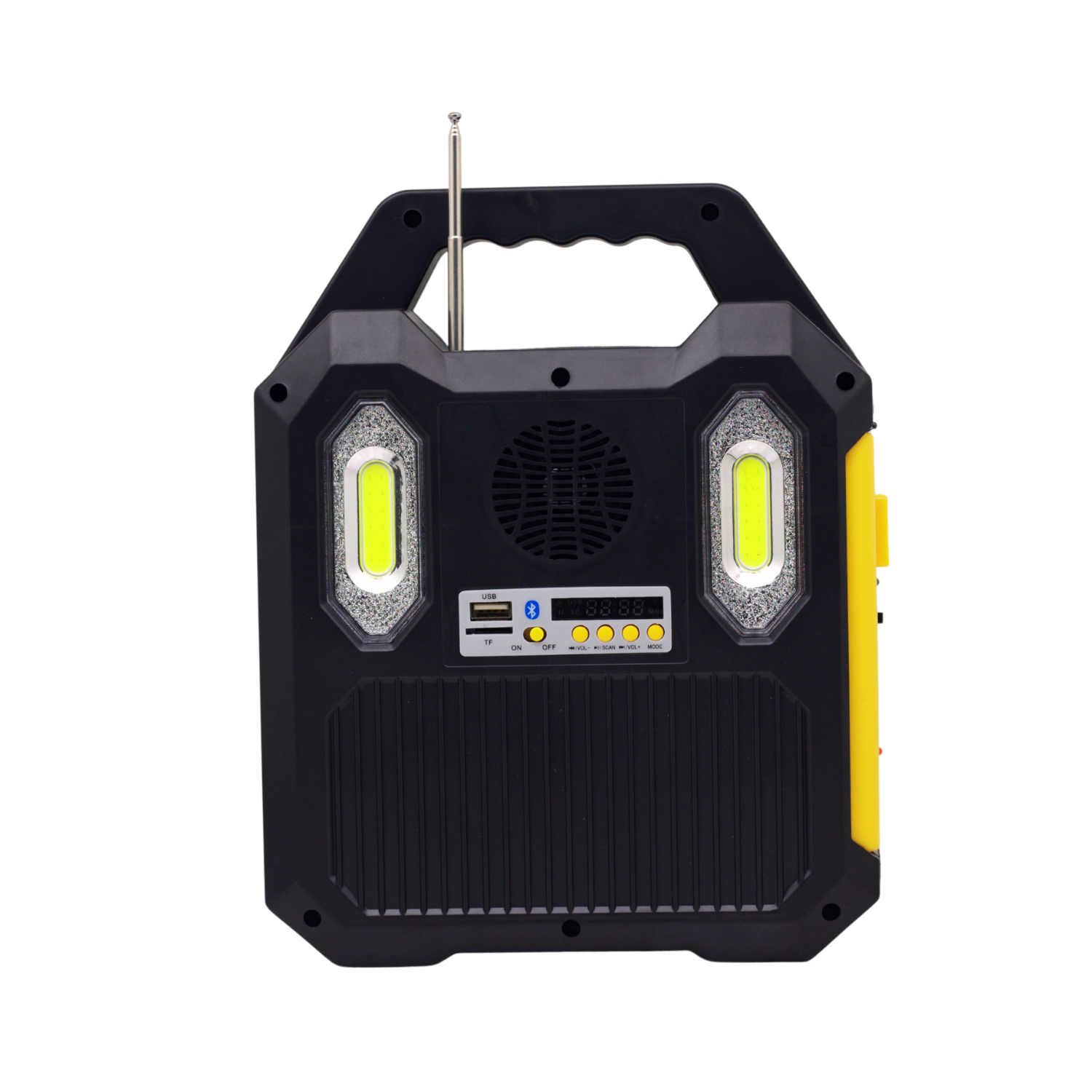 Equipo multifuncional diseñado para brindar energía y entretenimiento en cualquier lugar. Cuenta con una linterna de 6W, tres focos LED de alta eficiencia y un panel solar de 9V 3.8W que permite su recarga incluso sin acceso a electricidad. Además, incorpora radio FM, Bluetooth, reproductor MP3, puerto USB y altavoz, lo que lo convierte en una solución completa para el hogar, el camping o situaciones de emergencia. Gracias a su batería recargable y entradas de carga AC, ofrece versatilidad y autonomía en todo momento.