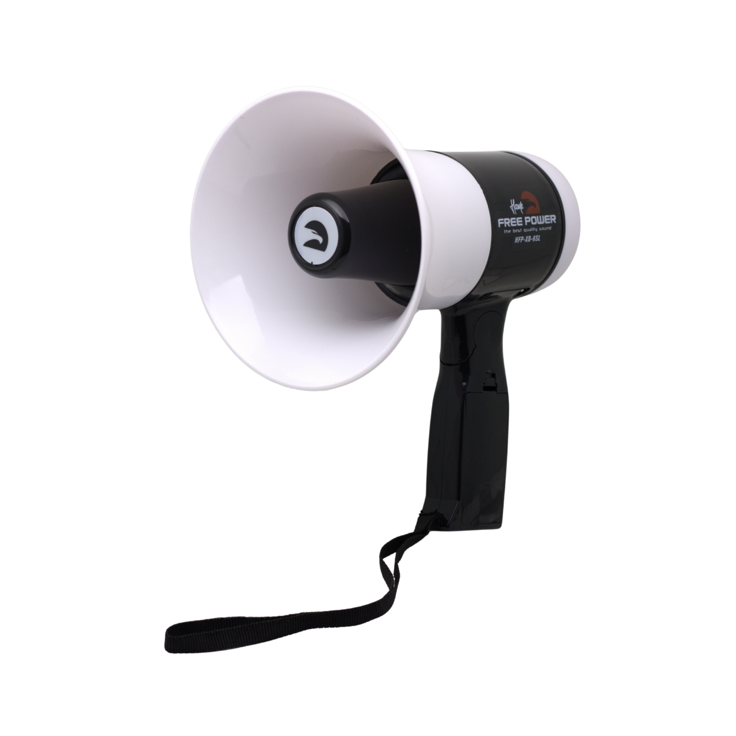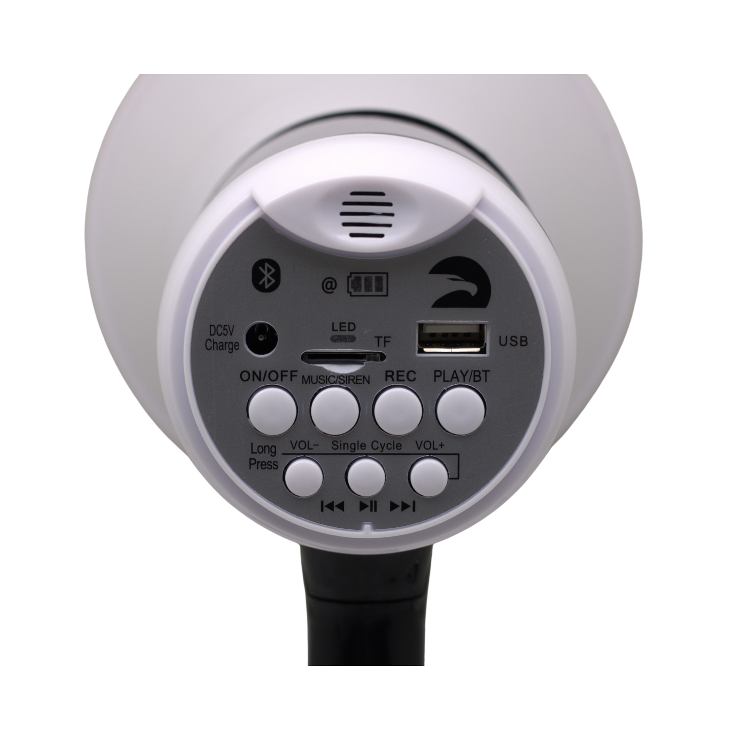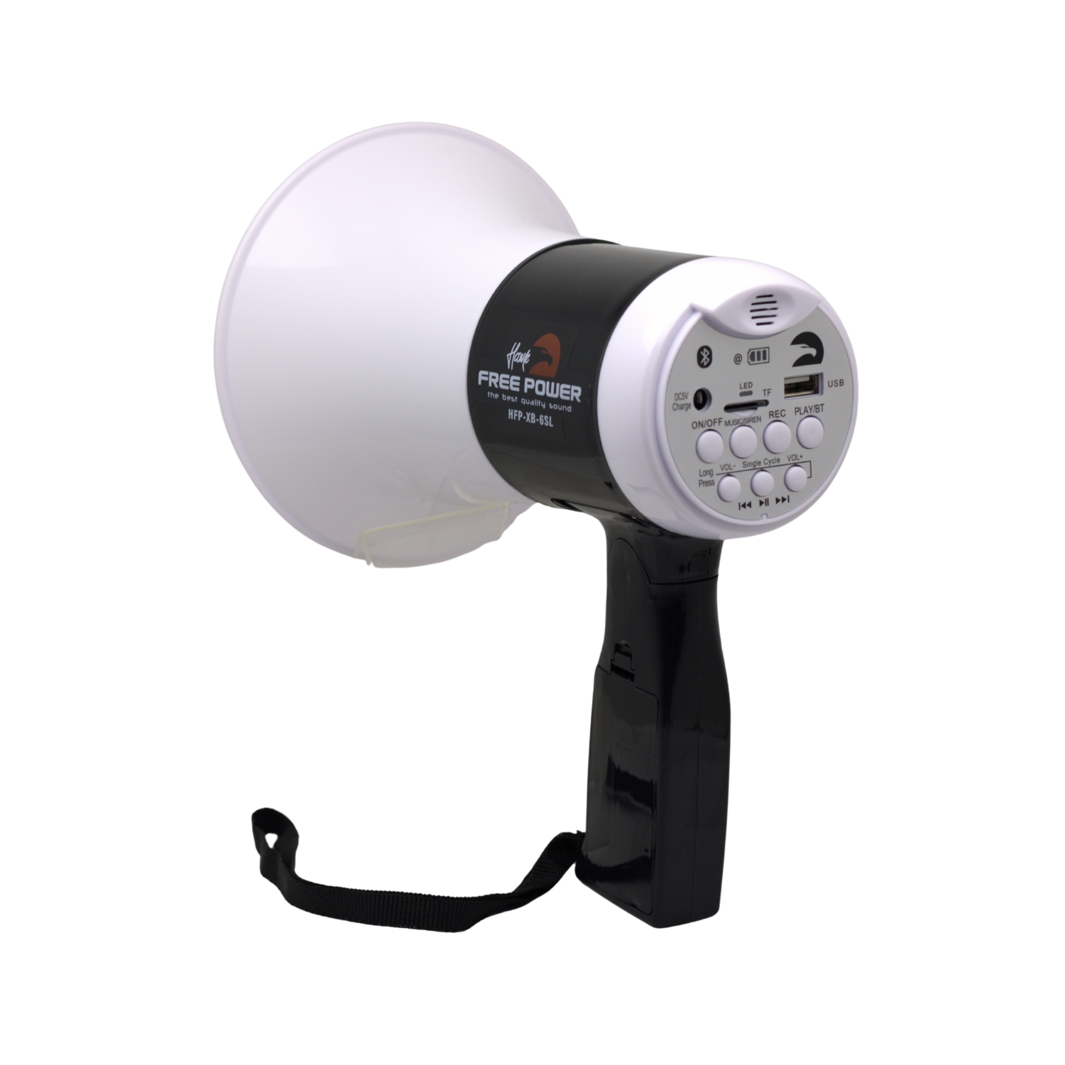 Megáfono portátil de 20W RMS / 40W máximo, con sistema de amplificación integrado y múltiples modos de operación: micrófono en vivo, reproductor MP3 y sirena.