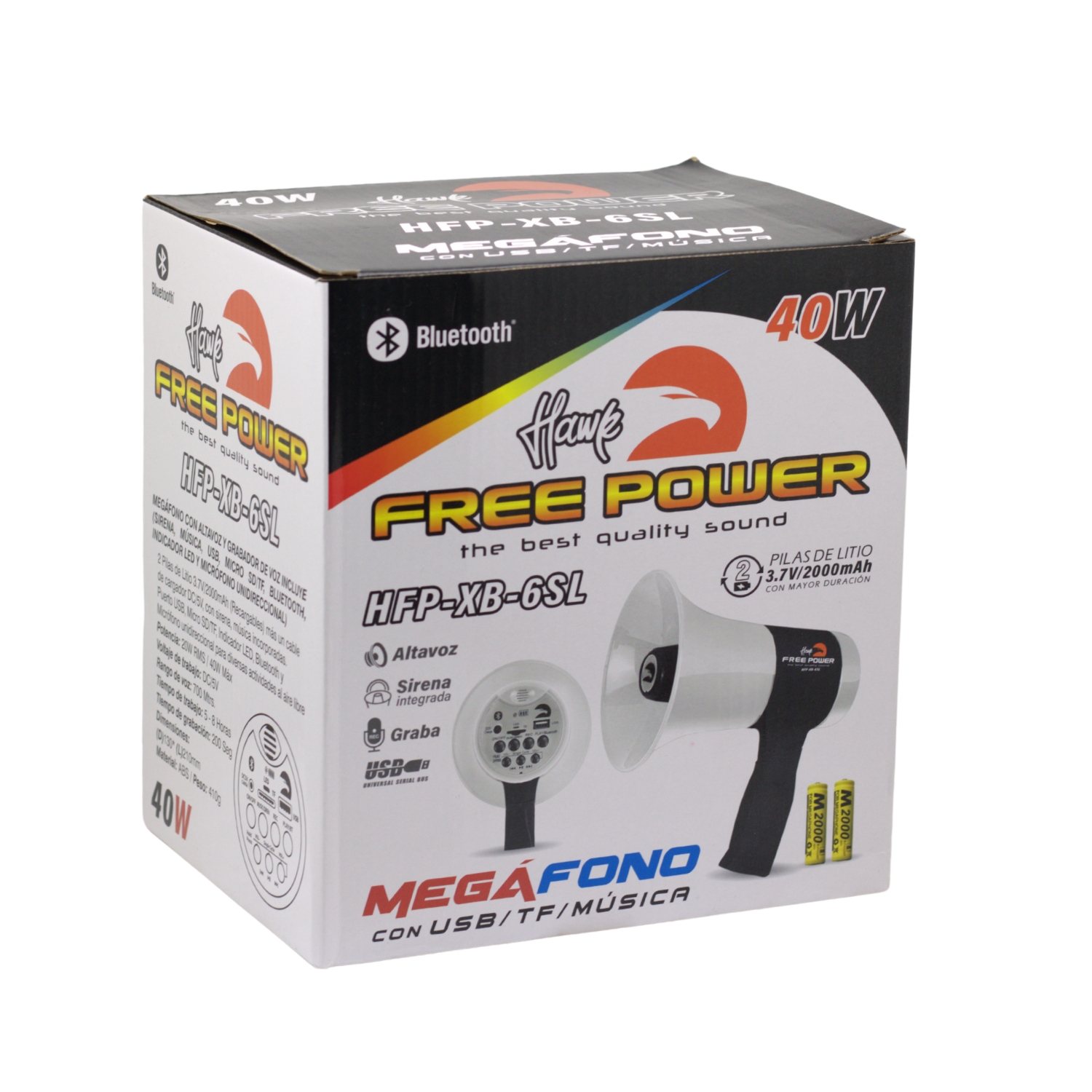 Cuenta con batería recargable de litio 3.7V 2000mAh (incluye 2 unidades), alimentación por puerto DC 5V y conectividad USB, Micro SD/TF y Bluetooth. Incorpora control de volumen, grabación de hasta 200 segundos y reproducción de 6 tonos de emergencia.