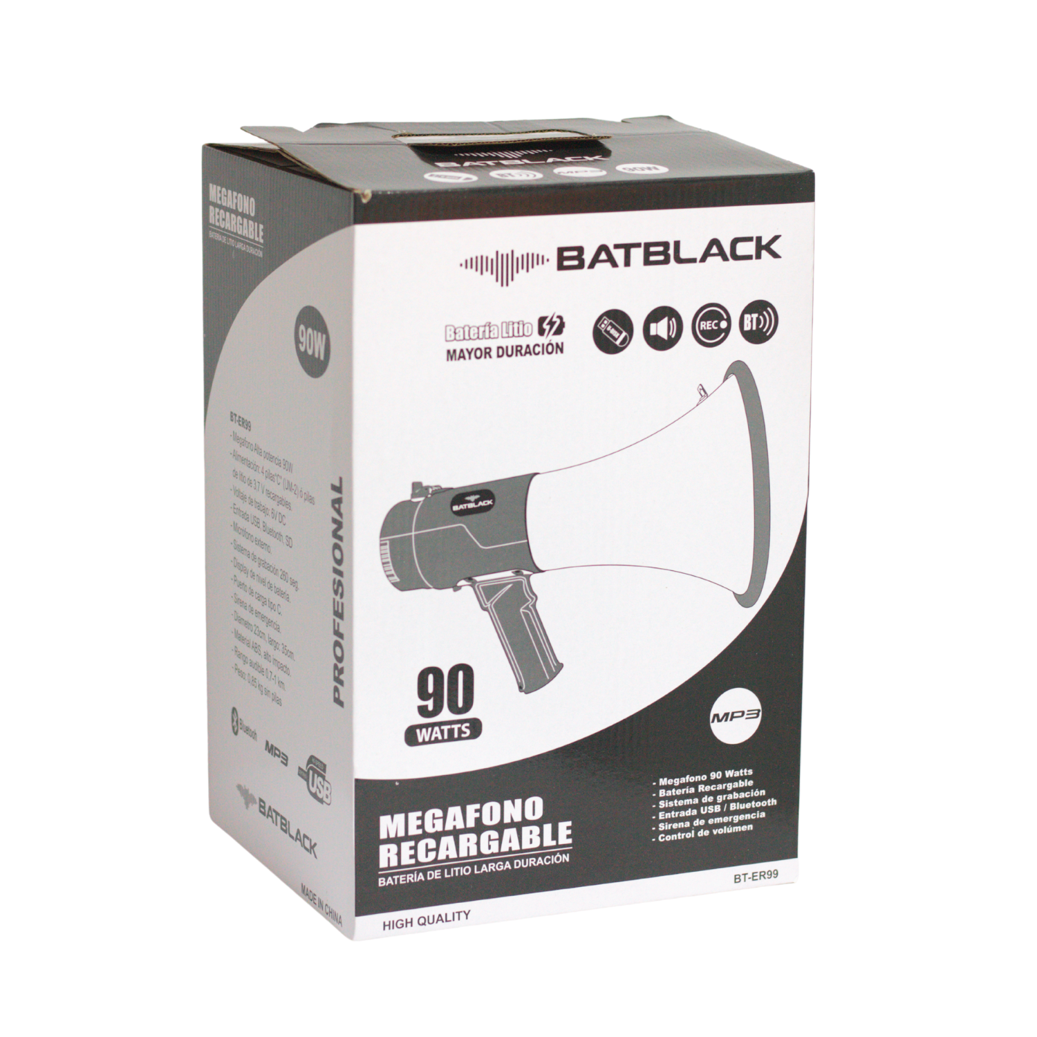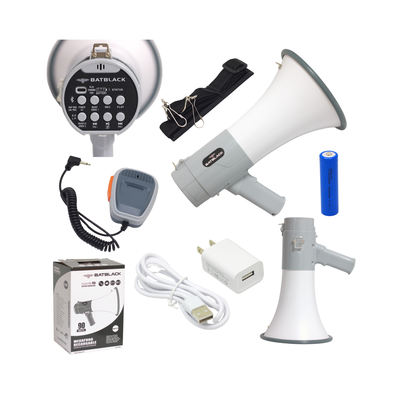 Incluye función de grabación de hasta 260 segundos, 4 sonidos pregrabados (sirenas y melodías), y selector de funciones para micrófono, música o sirena. Fabricado en ABS de alto impacto, es resistente, ligero (0.85 kg) y portátil, con correa ajustable para un transporte seguro.