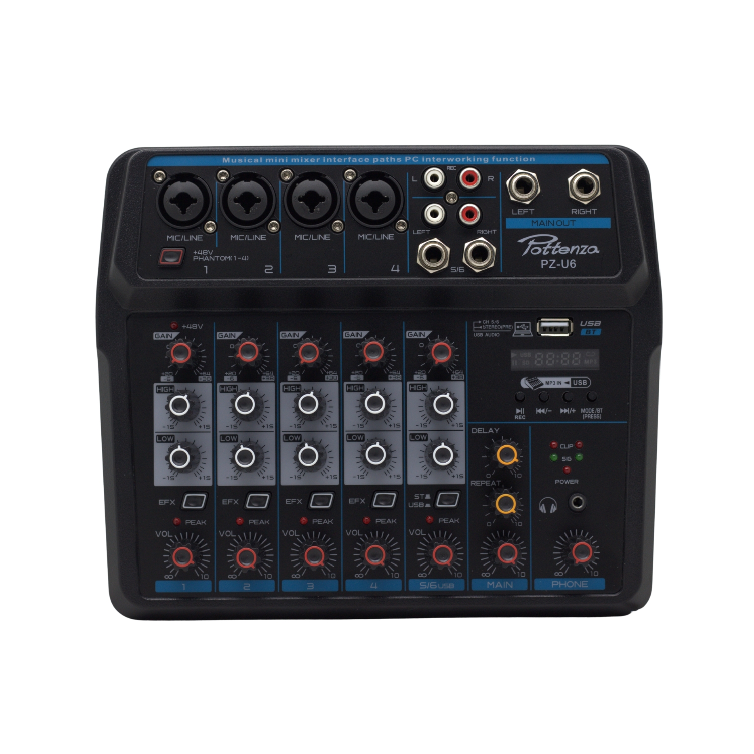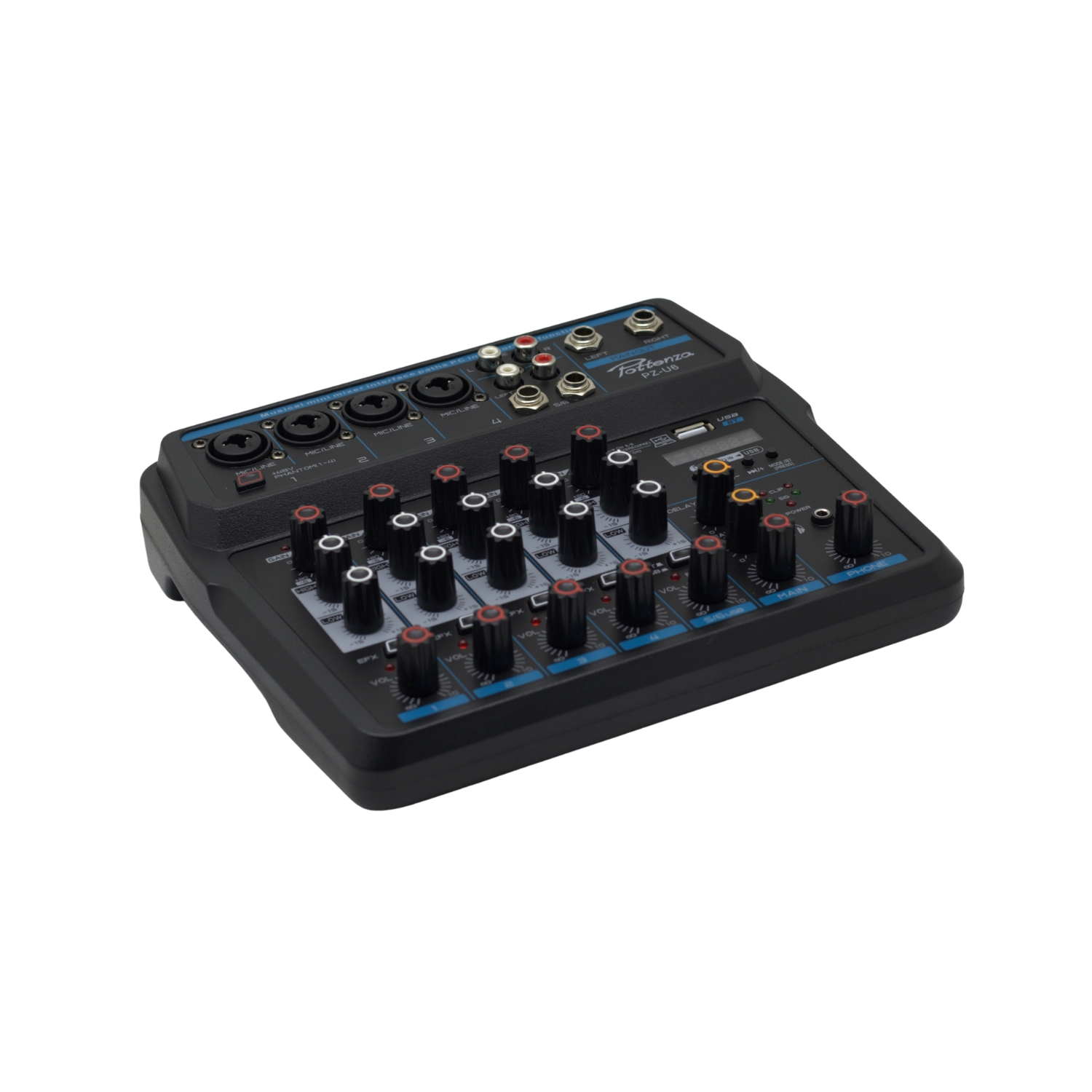 Mezcladora versátil diseñada para estudios caseros, músicos y creadores de contenido que buscan una solución práctica y profesional. Integra 6 canales de entrada, ecualización por canal, efectos de Delay y Repeat, y conectividad USB que permite grabar directamente en la computadora sin necesidad de interfaces adicionales.