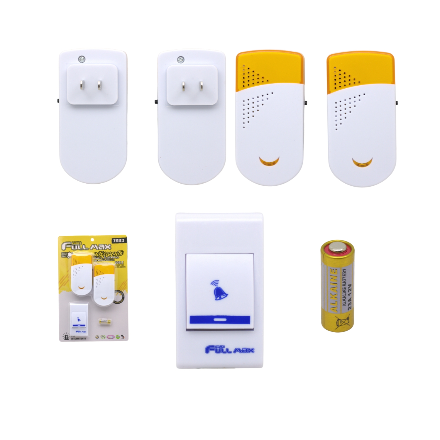 El transmisor funciona con batería de 12V tipo 23A y se instala fácilmente mediante cinta doble faz o tornillos. El receptor opera conectado a corriente y permite seleccionar el sonido deseado mediante un selector integrado.
