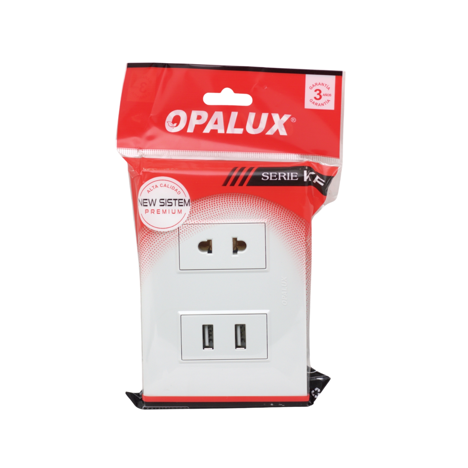 Opera en un rango de 120 a 250V e incorpora un tomacorriente universal junto con dos puertos USB integrados. Su estructura está fabricada en PVC antiinflamable para mayor protección. Las dimensiones son 18 cm de alto por 8.5 cm de ancho, lo que permite una instalación sencilla en diversos ambientes eléctricos residenciales o de oficina.