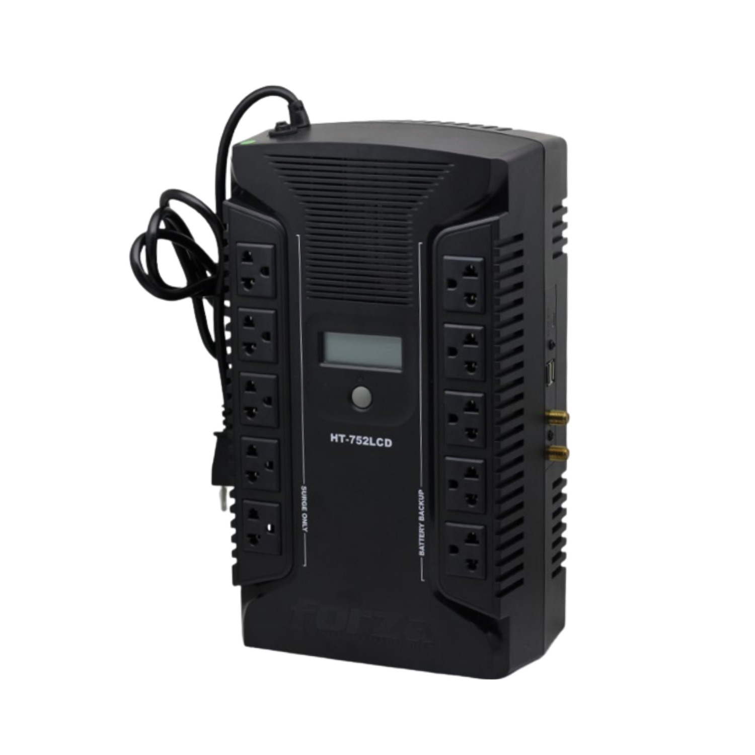 Dispone de 10 salidas . Incluye 5 salidas con respaldo de batería y 5 con supresión de picos únicamente. Ofrece apagado automático ante niveles de tensión críticos, indicadores LED, alarma audible y pantalla LCD informativa.